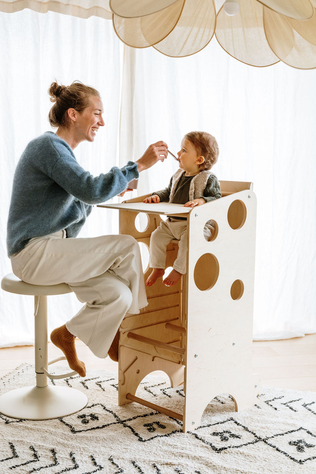 • Tour d'observation pour chaise haute : La tour Montessori chaise haute est spécialement conçue pour les plus petits. Elle peut être attachée à la chaise haute de votre enfant pour lui offrir un accès facile aux surfaces de travail. Elle est également facile à transporter, ce qui la rend idéale pour les déplacements.